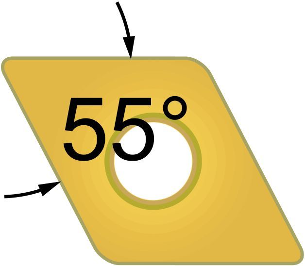 Сменная токарная пластина по металлу имеет ромбическую форму с углом 55°.
